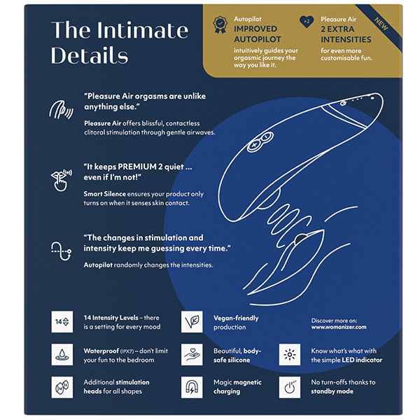 リアルなオーラルセックスでは体験できない快感が味わえる「ウーマナイザー プレミアム2 (ブルーベリー)」。従来品からパワーアップした本作では、ボタンを押さなくてもお肌に当てるだけで吸引が自動でスタートする「タッチセンサー」を搭載♪お肌から離すと吸引も自動でストップするので、ボタン操作に慣れていない人でも感覚的に楽しめます。また、強弱3段階の「パイロットモード」も搭載しているので予測できない楽しみを味わいたい!という人にもおすすめ。ボタン操作をしなくても吸引の強弱を自動でコントロールしてくれるので、ゆったりとラグジュアリーな時間を楽しみたいときにも最適♪吸引強弱機能は12から14段階へ!素材はシリコン/ABS樹脂で2時間のフル充電で連続4時間の使用が可能です。※製造時期によりパッケージが異なる場合がございます。※こちらの商品は受注発注商品の為、ご注文から発送までに3、4営業日掛かる場合が御座います。