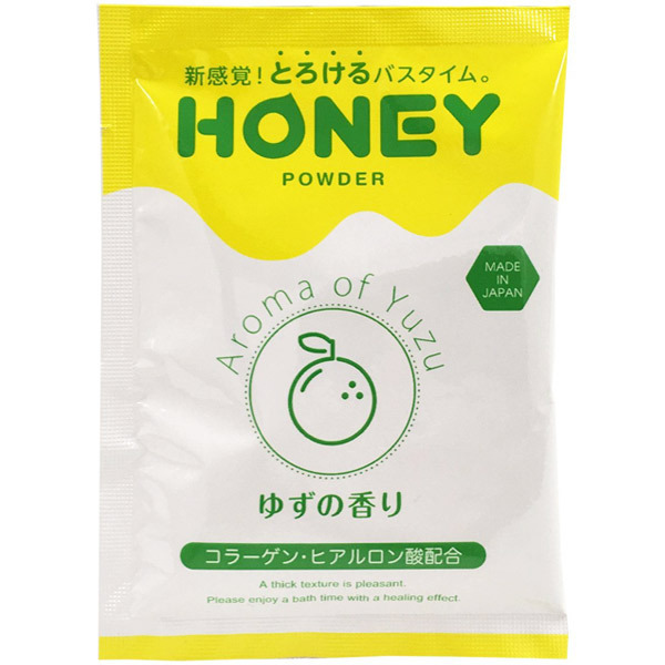 お風呂がまるごとローションに♪大人気のとろとろ入浴剤「honey」シリーズに、お手軽なパウダータイプの「ハニーパウダー ゆずの香り」が登場。●粉末タイプのとろとろ入浴剤●一回使い切りのパウチ入り(30g)●コンパクトサイズで携帯にも便利●お湯に溶かすだけのお手軽タイプ●3〜5分でローション風呂が完成●クセになるようなとろ〜り感触●爽やかな柑橘系ゆずの香り付き●コラーゲン&ヒアルロン酸配合●サッと洗い流せるので後処理も簡単。とろけるようなバスタイムをもっと手軽に♪お風呂がまるごとローションだったら…そんな願いをカタチにした大人気の入浴剤「honey」の粉末バージョン。お風呂に入れて混ぜるだけで、手軽にとろ〜りローション風呂が完成!お泊りデートや旅行にも携帯できるパウチ入りなので、贅沢な癒しのバスタイムをいつでも気軽にお楽しみいただけます。※【ご使用方法】浴槽にお湯150〜200Lを溜め、1包(30g)を入れてよくかき混ぜたら、3〜5分程度おいてからご入浴下さい。