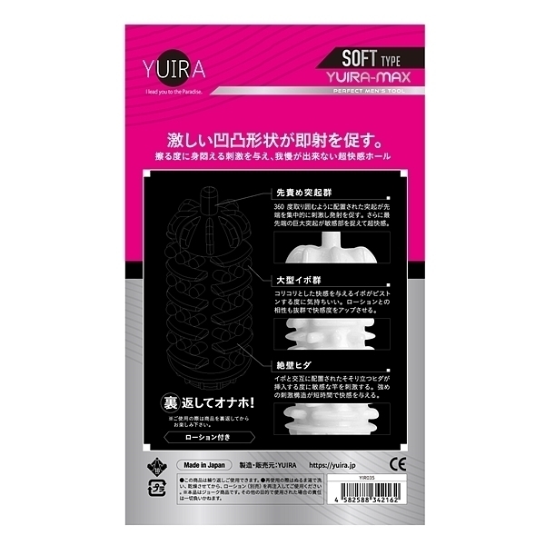裏返してオナホ!あの人気商品とYUIRAのコラボ実現!簡易オナホがソフトバージョンで新登場!ハードと違い、やわらか素材でアナタを優しく包み込みます♪<選べる3タイプ><安心の日本製><ローション付き>激しい凹凸形状が即射を促す、摩る度に身悶える刺激を与え、我慢が出来ない超快感ホール、先責め突起群、360度取り囲むように配置された突起が先端を集中刺激。最先端の巨大突起が敏感部を捉え超快感。大型イボ群、コリコリイボによりピストン運動する度に気持ちいい。ローションとの相性も抜群。絶壁ヒダ−イボとクロス配置されたそそり立ちヒダが何度もち〇ぽを刺激する。強烈刺激構造により短時間でフィニッシュ。※ご使用の際は本商品を裏返してからお楽しみください。