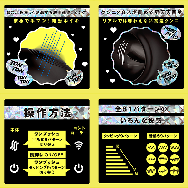 Gスポ覚醒!高速タッピング!超!愛を感じる舐め×手マンバイブ!トントンとGスポを刺激する高速タッピング機能はまるで手マンされているかのような極上快感!スベスベの舌で舐め上げるクンニはリアルでは味わえない超高速舌技!クンニ×Gスポ責めでたまらない快感_遠隔操作コントローラー付きなので、手放しでも楽しめます!中イキ開発にもオススメです_敏感な部分に直接触れるものだから、ぷにっとソフトな素材を使用しました。タッピング9パターン&舌舐め9パターン。完全防水IPX7等級&充電用USBケーブル付属&遠隔操作コントローラー付き●カラー:black