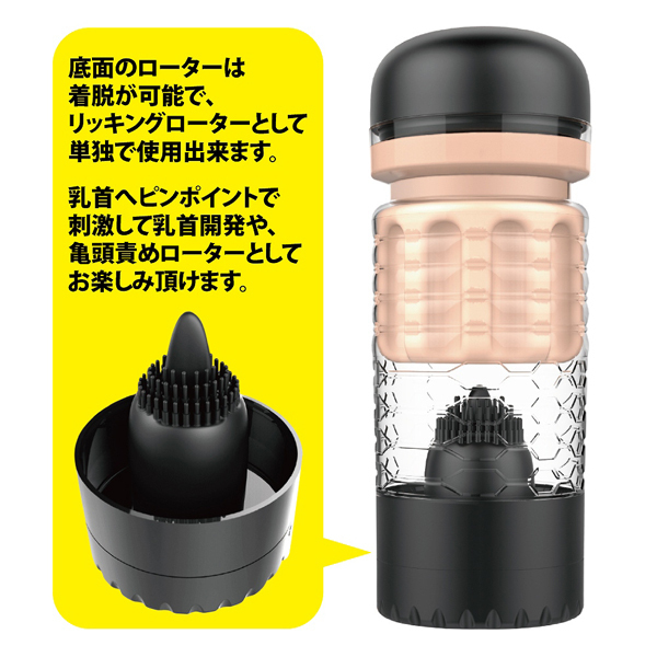 舌舐めローターが付いていて取り外しての単体使用も楽しめるプリティラブ ディープリッキングマスターベーター。最深部には驚愕の快感刺激が待ち受ける!肉肉しいまでのヴァギナホールの深部には高速でペロペロ舐めてくる舌が♪やわらかくて密着するエラストマー素材を使用し、ビッシリと配置したイボ突起が気持ちいい!オナホとしてはもちろん、分解して取り外した底面のダイヤル式リッキング振動スピードローターは取り外して単体でも使用可能です!振動の強弱調整はダイヤル式、単4電池を3本使用。丸洗いもしていただけます◎