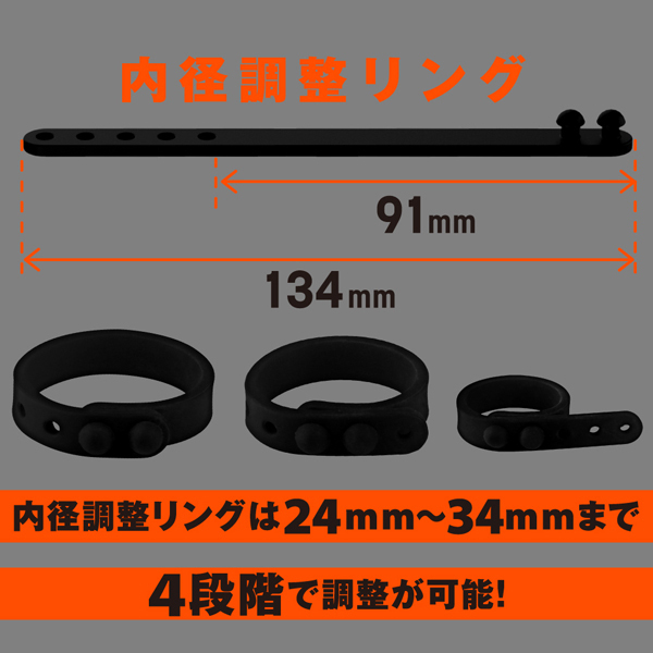 しっかり固定して外れにくい!高品質シリコンの弾力性に優れたペニスリング。ベタつきのないサラスベ質感で着け心地抜群!一つだけ使うも良し同時装着もOK♪皮戻り防止や持続力アップなどシチュエーションに合わせてお使いください。内径23mmの小サイズ、26mmの中サイズ、30mmの2連リング、そして自分の身体に合わせてサイズ変更できる内径調整リングの4個付属。