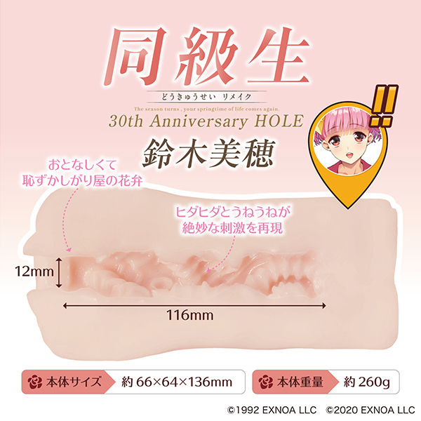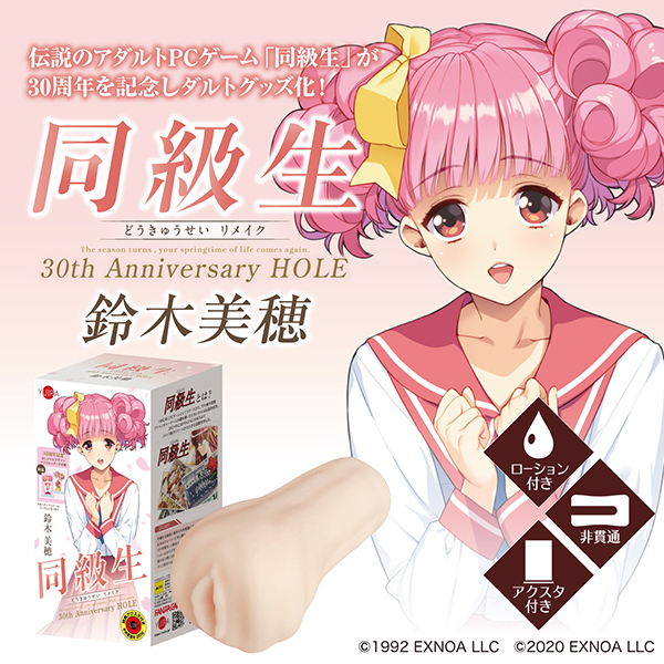 美少女ゲーム界に革命を巻き起こした伝説的作品「同級生」。そんな名作の生誕30周年を記念して作品キャラクターをイメージしたオナホールが登場!「同級生30th Anniversary HOLE」はここがオススメ。各キャラクターの内部をイメージ、再現したオナホール、本商品付属でしか手に入らない特製アクリルスタンドを同封。新旧イラスト両面印刷の30周年ならではのアイテムです!スティックローション付属ですぐ使えます。鈴木美穂